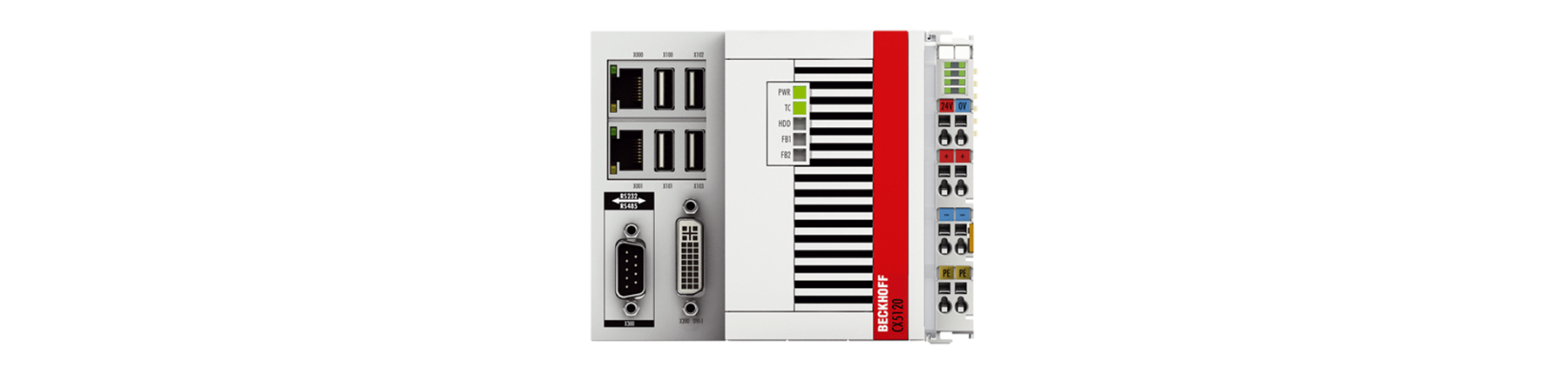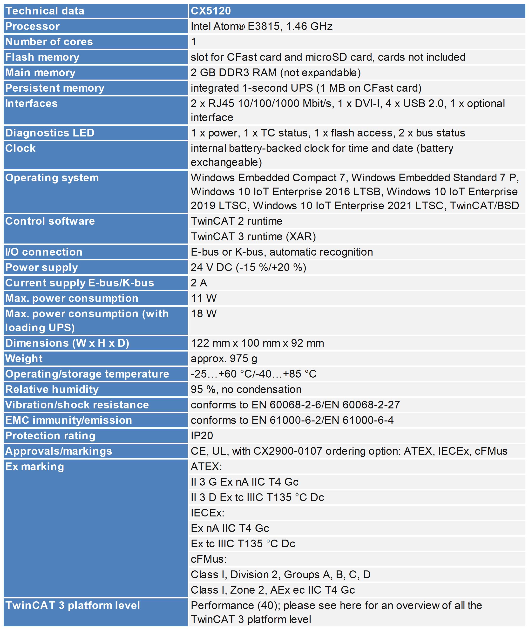 CX5120有一个Intel Atom®时钟速率为1.46GHz的单核处理器。此系列中的硬件接口的方向和实现方式与现有CX5000系列相同。两个独立的、支持千兆位的以太网接口以及四个USB 2.0和一个DVI-I接口可用。许多其他连接选项或网关功能由可选接口创建,该接口可在工厂预装,以及I/O级,可选择性地由E总线或K总线终端组成。