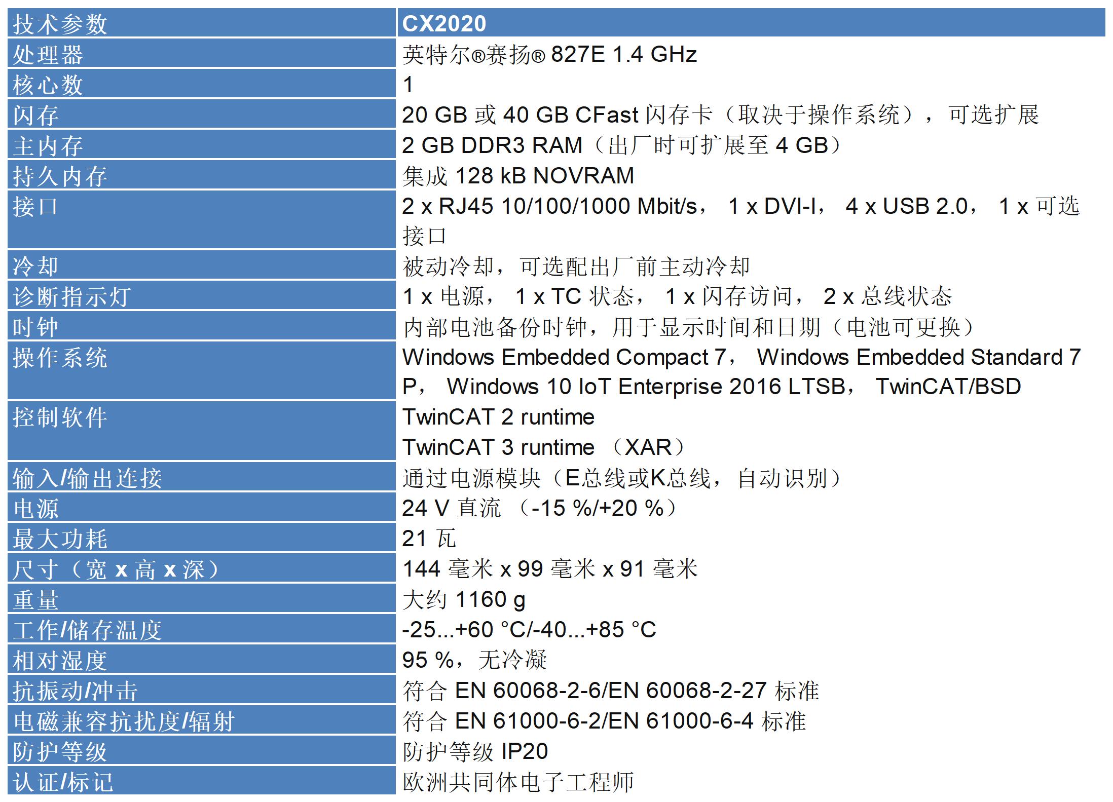 CX2020有一个1.4GHz英特尔®赛扬®CPU,它是无风扇和没有旋转组件。除了CPU和芯片组,CX2020还包含标配2 GB RAM的主存。4 GB可以作为选项。控制器从CFast闪存卡引导。CX2020的基本配置包括一个CFast存储卡、两个独立的Gbit以太网接口、四个USB2.0接口和一个DVI-I接口。CPU有一个128 kB的NOVRAM持久数据存储器,用于不使用UPS的情况。该单元可以选择与现场总线或串行接口订购。CX2000系列的其他组件可以通过两侧的多引脚端子连接。操作系统为Microsoft Windows Embedded Compact 7、Windows Embedded Standard 7 P或Windows 10 IoT Enterprise 2016 LTSB。TwinCAT自动化软件将CX2020系统转换成一个功能强大的PLC和运动控制系统,可以使用或不使用可视化操作。CX2020具有高性能,可与TwinCAT NC I进行三维轨迹插补,最多可连接四个基本CPU模块。连接顺序无关紧要。模块内部通过PCI Express连接,并可随后连接到现场CPU。CPU模块的电源来自连接在CPU右侧的CX2100电源模块。另外两个CFast存储卡模块(CX2550-0010)可以连接在电源单元和CPU之间,从而总共可以使用多达三个CFast卡。RAID可用于使用多个CFast卡的情况。扩展的工作温度范围在-25°C至+60°C之间,使其能够在气候要求高的情况下应用。